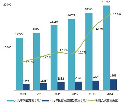 2009年以來,受惠于中國居民人均收入增加和消費習慣養成,中國居民人均教育文娛消費支出保持良好增長形勢,由2009年的1473元逐步攀升,截止2014年底已達到2569元。對比2009-2012年期間教育文娛支出占比保持在12.2%上下水平,此數值在2014年達到了13%的新高度,主要原因為:在線教育和兒童教育市場快速成長;文化娛樂內容,尤其是電影、綜藝、網絡劇及網絡綜藝的受眾覆蓋面進一步加寬,文化娛樂內容的便捷支付、習慣養成和消費意識崛起。