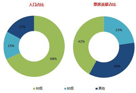 電影消費用戶群體也呈現年輕化特征,其中68%的用戶為90后,他們同時貢獻了23%的票房,相比于80后群體,90后電影消費用戶比較青睞預先購票,以降低單片支付成本。
