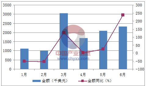 2016年1-6月中國(guó)花生油出口金額統(tǒng)計(jì)圖