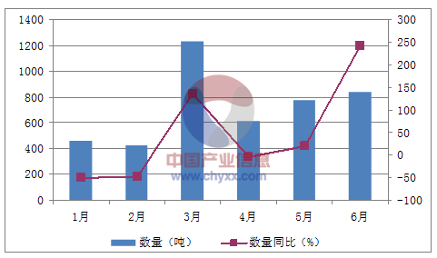 月份數(shù)量(噸)金額(千美元)數(shù)量同比(%)金額同比(%)1月4611,125-50.9-51.12月4261,010-48.7-52.93月1,2353,059136.1128.34月6151,700-4.62.75月7782,09020.824.26月8412,321242.3237.1數(shù)據(jù)來(lái)源:中國(guó)海關(guān),中經(jīng)先略數(shù)據(jù)中心整理