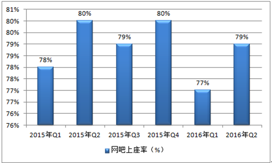2016年一季度網吧上座率為77%, 2016年二季度網吧上座率為79%,相比2015年一季度、二季度略有下降;2016年中國網吧上座率依舊維持在8成左右,經營狀態穩定。