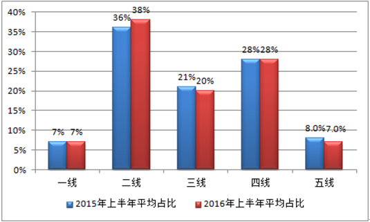 2016年上半年一線城市網吧占比7%,二線城市網吧占比38%,三線城市網吧占比20%,四線城市網吧占比28%,五線城市網吧占比7%。網吧主要集中在二線城市,且占比略有增長。