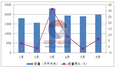 2016年1-6月中國平板玻璃出口數(shù)量統(tǒng)計(jì)圖