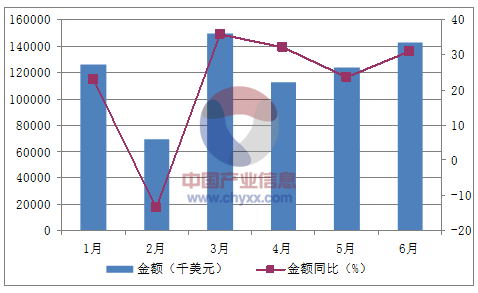 2016年1-6月中國平板玻璃出口金額統(tǒng)計(jì)圖