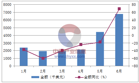 2016年1-6月中國鉬礦砂及其精礦出口金額統計圖