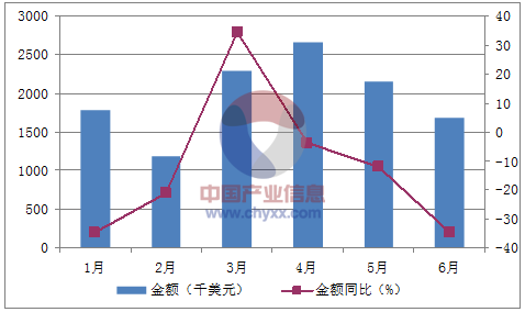 月份數(shù)量(噸)金額(千美元)數(shù)量同比(%)金額同比(%)1月1,0631,777-28.8-34.72月6261,194-25.7-21.13月1,3762,2993934.24月1,5972,6589.3-3.95月1,1932,154-10.7-126月8431,690-37.1-34.8數(shù)據(jù)來源:中國海關(guān),中經(jīng)先略數(shù)據(jù)中心整理