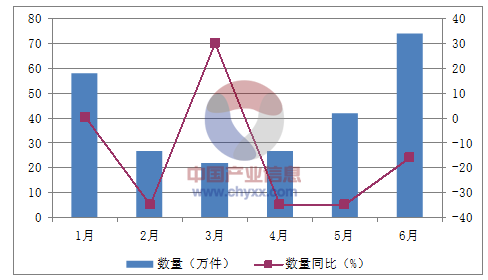 2016年1-6月中國皮革服裝出口數(shù)量統(tǒng)計(jì)圖