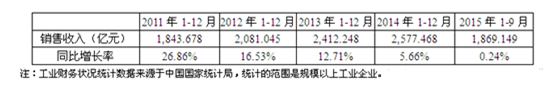 2015年1-9月,閥門和旋塞制造業銷售收入總額達到1869.149億元,同比增長0.24%,低于工業平均水平(增長1.16%)。2015年1-9月行業銷售增長速度較慢。