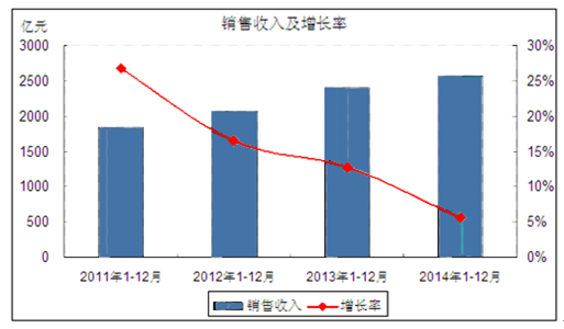 2011-2014年,閥門和旋塞制造業銷售收入走勢