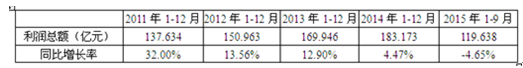 2015年1-9月,閥門和旋塞制造業利潤總額達到119.638億元,同比下滑4.65%,低于工業平均水平(下滑1.68%)。2011-2015年閥門和旋塞制造業利潤總額