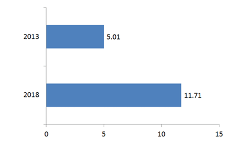 LED原材料市場2013年的市場規模達到50.1億美元的銷售額,到了2018年,將可達117.1億美元,也就是這五年之間的市場規模要翻兩倍之多。
