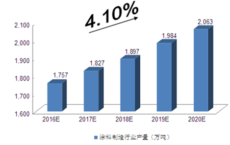 綜合以上因素預計2016年我國涂料制造行業(yè)產量將達到1,757萬噸,未來五年(2016-2020)年均復合增長率約為4.10%,2020年產量將達到2,063萬噸。