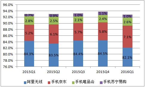2015Q1-2016Q1中國移動購物企業(yè)交易規(guī)模市場占比