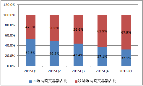2015Q1-2016Q1中國網(wǎng)購交易額PC端和移動端占比