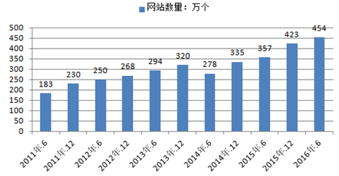 截至2016年6月,中國網站數量為454萬個,半年增長7.4%。中國網站數量