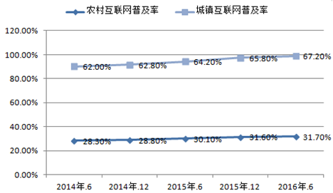農村互聯網普及率保持穩定,截至2016年6月為31.7%。但是,城鎮地區互聯網普及率超過農村地區35.6個百分點,城鄉差距仍然較大。
