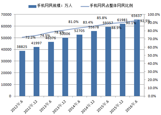 截至2016年6月,我國手機網民規模達6.56億,較2015年底增加3656萬人。網民中使用手機上網的比例由2015年底的90.1%提升至92.5%,手機在上網設備中占據主導地位。同時,僅通過手機上網的網民達到1.73億,占整體網民規模的24.5%。