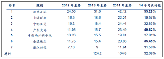 院線并未表現(xiàn)集中趨勢(shì),前七大院線票房2014年共計(jì)164.8億元,同比增長32.69%,低于行業(yè)36%的整體增速。