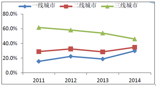 最初,院線及影院的建設(shè)主要集中在一線城市,票房收入占比較高,放映設(shè)施先進(jìn)、入駐重要商圈及購物中心的影院通常體現(xiàn)出較高的經(jīng)濟(jì)效益,近幾年商業(yè)地產(chǎn)開發(fā)保持較快增長,購物中心不斷涌現(xiàn),參照美國院線的發(fā)展歷史,商業(yè)與影院的緊密結(jié)合已成為成熟模式,兩者的景氣度也高度相關(guān),而一線城市在居民分布、區(qū)域規(guī)劃調(diào)整的過程中,也給影院建設(shè)帶來新的機(jī)會(huì)。隨著一線城市競爭加劇、商業(yè)體及區(qū)位規(guī)劃逐漸穩(wěn)定,一些經(jīng)濟(jì)發(fā)達(dá)地區(qū)的二三四線城市需求升級(jí),成為院線擴(kuò)張的重要方向,從數(shù)據(jù)上看,二三線城市票房收入、觀影人次實(shí)際增速已明顯高于一線城市,影院數(shù)量與人們觀影的需求并不匹配。