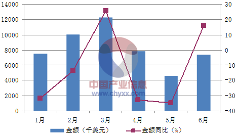 2016年1-6月中國二極管及類似半導體器件出口金額統計圖