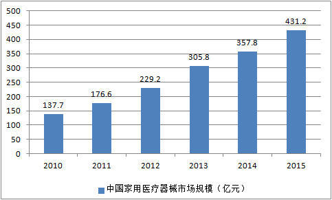 在行業(yè)政策大力支持、人口老齡化加速、國(guó)民保健意識(shí)加強(qiáng)、家庭醫(yī)療消費(fèi)能力的提升以及自主研發(fā)技術(shù)水平的提高等背景下,我國(guó)家用醫(yī)療器械市場(chǎng)需求規(guī)模持續(xù)高速增長(zhǎng)。中國(guó)家用醫(yī)療器械行業(yè)是醫(yī)療器械領(lǐng)域中增長(zhǎng)最快的子行業(yè)之一,居民消費(fèi)升級(jí)是直接的推動(dòng)力,制氧機(jī)、電子體溫計(jì)、血壓計(jì)、血糖儀、疾病監(jiān)控系統(tǒng)等便攜式醫(yī)療設(shè)備進(jìn)入越來(lái)越多的家庭。2014年,我國(guó)家用醫(yī)療器械市場(chǎng)規(guī)模是357.8億元;2015年,我國(guó)家用醫(yī)療器械的市場(chǎng)規(guī)模達(dá)到431.2億元。2010-2015年中國(guó)家用醫(yī)療器械市場(chǎng)規(guī)模統(tǒng)計(jì)