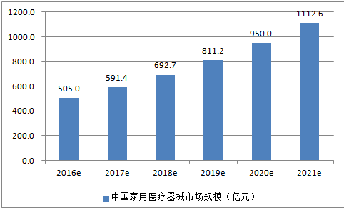 美國(guó)家用醫(yī)療器械市場(chǎng)的人均消費(fèi)水平為國(guó)內(nèi)的20~30倍左右,因此國(guó)內(nèi)市場(chǎng)家用醫(yī)療器械提升空間還很大,預(yù)計(jì)未來(lái)幾年將繼續(xù)維持17%以上的年增長(zhǎng)率。到2021年中國(guó)家用醫(yī)療器械行業(yè)市場(chǎng)規(guī)模將達(dá)到1112.6億元。