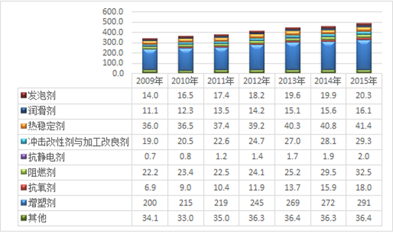 2009-2015年我國(guó)塑料助劑各細(xì)分產(chǎn)品需求統(tǒng)計(jì)圖:萬噸