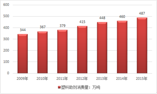 2014年我國(guó)塑料助劑需求總量為460萬噸,2015年需求總量約為487萬噸,塑料助劑消費(fèi)量較2014年同期增長(zhǎng)5.9%。