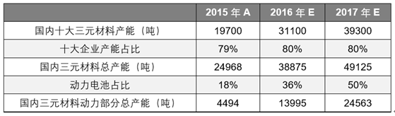 根據(jù)對(duì)未來三元材料企業(yè)發(fā)展趨勢(shì)的分析,未來國(guó)內(nèi)三元材料龍頭企業(yè)產(chǎn)能占比仍能維持 在較高水平,參考 2015 年 79%的產(chǎn)能占比,預(yù)計(jì)未來前十大企業(yè)的產(chǎn)能占比基本維持在 80% 左右,并據(jù)此測(cè)算出國(guó)內(nèi)三元材料的總產(chǎn)能。而根據(jù)高工鋰電資料,2015 年 NCM 中 18%用于動(dòng) 力電池,EV Tank 則預(yù)測(cè)到 2017 年動(dòng)力電池占比能達(dá)到 50%左右,預(yù)計(jì)未來兩年動(dòng)力 電池在三元材料應(yīng)用中的占比分別為 36%和 50%,同時(shí)測(cè)算出 2016 年、2017 三元材料動(dòng)力部分 的整體產(chǎn)能在 14000 噸和 25000 噸左右。