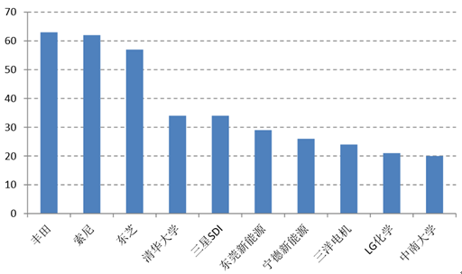 專利主要集中在日韓手中,排名前三位分別是豐田、索尼和東芝,而近年來國(guó)內(nèi)企業(yè)和高校也開始 布局三元專利。全球三元材料專利擁有量排名前十的公司