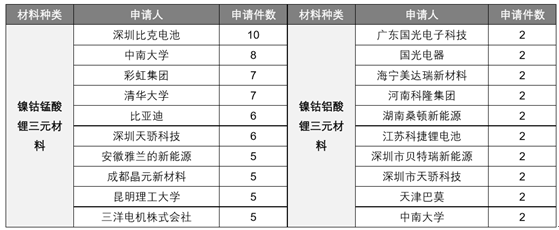主要三元正極材料在華重點(diǎn)專利申請(qǐng)排名前 10 位的機(jī)構(gòu)