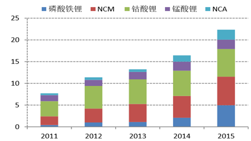 相對(duì)電子產(chǎn)品,電動(dòng)汽車對(duì)三元的需求量更大,例如手機(jī)用鋰電池大約消化 5g 左右三元正極材料,而一輛乘用車動(dòng)力電池對(duì)三 元正極的消耗量高達(dá) 300kg。2015 年中國(guó) NCM 市場(chǎng)出貨量約為 3.05 萬(wàn)噸,同比增長(zhǎng) 45.2%,產(chǎn) 值約 32.7 億元,同比增長(zhǎng) 35%;NCA 由于其較強(qiáng)的化學(xué)活性對(duì)電池?zé)峁芾硐到y(tǒng)要求非常高,在 國(guó)內(nèi)市場(chǎng)出貨仍較少,2015 年出貨量約為 2000 噸。