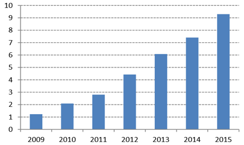 2015 年全球的正極材料出貨量為 22.34 萬(wàn)噸,與 2014 年相比增長(zhǎng) 35.89%,其中 NCM、NCA 均大幅增長(zhǎng)。NCM 主要受益于中國(guó)動(dòng)力電池需求的 帶動(dòng),而 NCA 主要供給特斯拉電動(dòng)車。從三元材料銷量來看,全球市場(chǎng)三元材料銷量呈現(xiàn)快速增 長(zhǎng)態(tài)勢(shì),由 2009 年的 1.2 萬(wàn)噸快速增長(zhǎng)至 2015 年的超過 9 萬(wàn)噸,年均復(fù)合增速達(dá)到 40%。