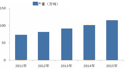 2014年,全國針刺非織造布總產量101.22萬噸,同比增長12.3%;2015年,全國針刺非織造布總產量約115.41萬噸。2011-2015年全國針刺非織造布總產量