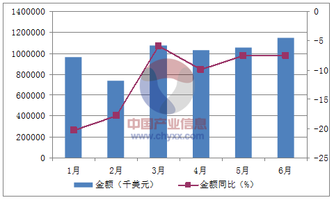 月份數量(百萬塊)金額(千美元)數量同比(%)金額同比(%)1月2,268966,700-8-20.32月1,660737,598-19.4-17.83月2,3291,076,638-7.2-5.94月2,3391,029,746-9.5-9.95月2,3431,056,090-12.3-7.56月2,5131,150,6840.9-7.6數據來源:中國海關,中經先略數據中心整理
