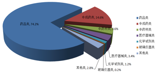 按銷售品類分類,藥品類3銷售居主導地位,銷售額占七大類醫(yī)藥商品銷售總額的 74.2%,其次為中成藥類占 14.6%,中藥材類占 3.6%,醫(yī)療器械類占 3.4%,化學試劑類占 1.2%,玻璃儀器類占 0.2%,其他類占2.8%。