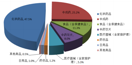 據(jù)中國醫(yī)藥商業(yè)協(xié)會典型樣本城市零售藥店2015年品類銷售統(tǒng)計,零售藥店銷售額中的藥品類占主導地位,占零售總額的80.7%,其中化學藥品占47.5%、中成藥占25.2%、中藥飲片占8.0%;非藥品銷售占19.3%,其中食品(含保健食品)占11.3%,而藥妝品、日用品和其他商品這三類總占比不足3%。