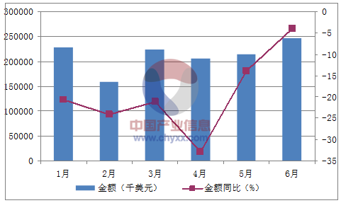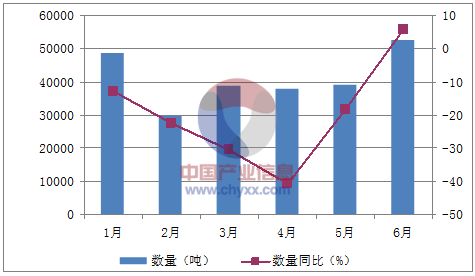 月份數(shù)量(噸)金額(千美元)數(shù)量同比(%)金額同比(%)1月48,485227,847-12.8-20.72月29,830158,401-22.3-24.13月38,828223,959-30.5-21.14月37,765205,209-40.7-32.95月38,896213,548-18.1-13.96月52,639245,9815.9-4數(shù)據(jù)來源:中國海關(guān),中經(jīng)先略數(shù)據(jù)中心整理