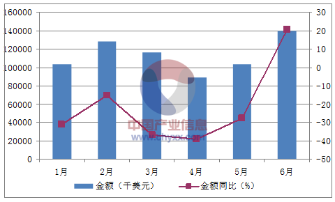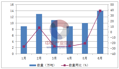 月份數量(萬噸)金額(千美元)數量同比(%)金額同比(%)1月9103,503-27-312月13128,5377.8-15.13月11116,222-26.7-36.94月989,004-25.9-38.95月10103,227-21.3-27.86月14139,43738.120.7數據來源:中國海關,中經先略數據中心整理