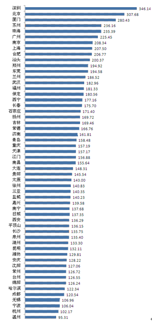 將2016年6月56城市住宅投資收益指數與GDP指數比較后發現,對絕大部分城市而言(溫州、唐山除外),投資住宅仍是不錯的選擇。其中排名前3的投資收益指數分別為:346.14(深圳)、307.68(北京)、280.43(廈門),排名倒數3位的投資收益指數分別為:94.22(唐山)、95.31(溫州)、杭州(102.17)。