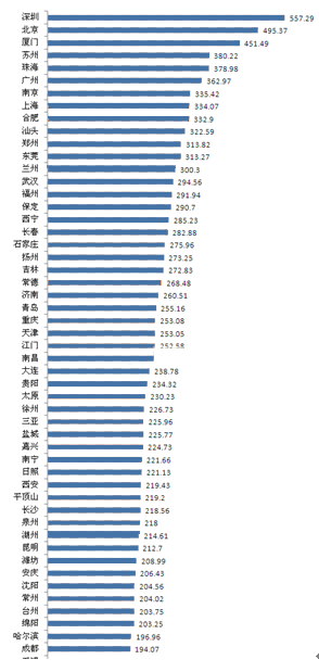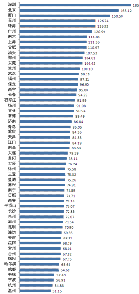 在將2016年6月56城市住宅投資收益與2016年6月的M2進行比較后發現,依然有13城市的投資收益指數大于100,分別為:深圳(185.76)、北京(165.12)、廈門(150.50)、蘇州(126.74)、珠海(126.33)、廣州(120.99)、南京(111.81)、上海(111.36)、合肥(110.97)、汕頭(107.53)、鄭州(104.61)、東莞(104.42)、蘭州(100.10)。