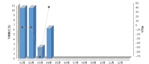 2016年1~4月,全國食品行業累計虧損額同比增長-7.44%。其中:1月份虧損額同比增長0.74%;2月份虧損額同比增長0.74%;3月份虧損額同比增長-66.07%;4月份虧損額同比增長46.97%。