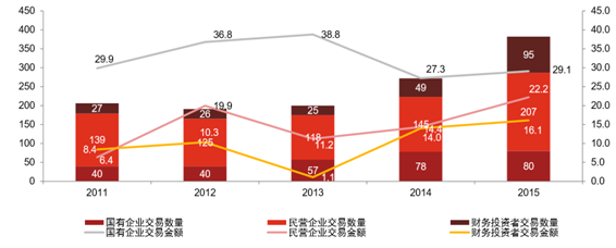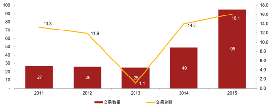 戰略投資者并購交易數量與金額(2011年至2015年期間)(單位:個、億美元)