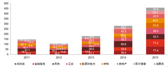 2015年,科技與金融行業持續成為投資熱點,其主要驅動因素為投資者對科技行業高增長 的期待、科技行業逐漸發生整合、以及中國金融服務和支付企業務的高速發展而產生的融 資需求。