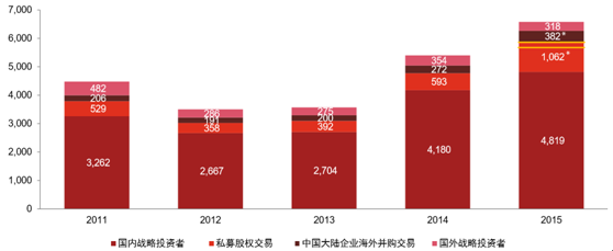 私募股權基金交易,2011年至2015年(單位:億美元)