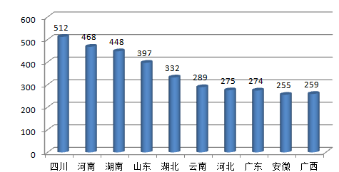 2015年豬肉產量前10的省份分別為四川、河南、湖南、山東、湖北、云南、河北、廣東、安徽、廣西等省份。