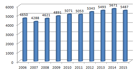 2015年豬肉總產量為5487萬噸,較2014年減少3.25%。2011-2015年豬肉總產量復合增長率(CAGR)為1.63%。
