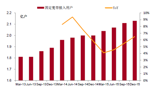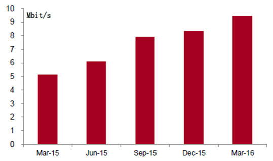 OTT盒子熱潮的興起與近年來國內寬帶互聯網的高速發展密不可分。截止2015年12月,三家基礎電信運營商固定寬帶接入用戶達2.13億戶,同比增長6.5%,寬帶接入用戶數量的持續增長為其他基于互聯網開展的業務提供了廣泛的用戶基礎。除了用戶數量的持續增長外,我國互聯網網速逐漸提升。