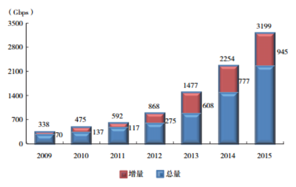 2008 年至 2014 年,中國骨干網間 互通帶寬提升 8 倍。國際互聯網出入口帶寬以年均 15%的速率增長,2015 年 6 月達到 4607Gbps。中國骨干網容量大幅提升,單端口帶寬能力從 Kbps 提升至 100Gbps,骨干網 帶寬已超 100Tbps。目前國內已經在十個城市建設了互聯網國家交換中心節點,其互聯互通 的帶寬達到了 4Tbps ,假設互聯互通的平均價格 20 萬/Gbps/月,市場規模為 96 億。通過 第三流量中介轉售的穿透帶寬規模應該為正規互聯互通的 4-5 倍,按照預計 16T 帶寬和 5 萬 /Gbps/月售賣價格,估算市場規模在 96 億左右。