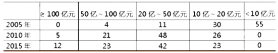 2005年制藥百強中55%的企業規模集中在10億元以下,2015年制藥百強的規模則多集中在20億~50億元區間。2010年有5家企業首次突破100億元大關,到了2015年已有12家,其中200億元以上的就有5家;50億~100億元的企業有23家。制藥百強企業擴張勢頭十分迅猛。